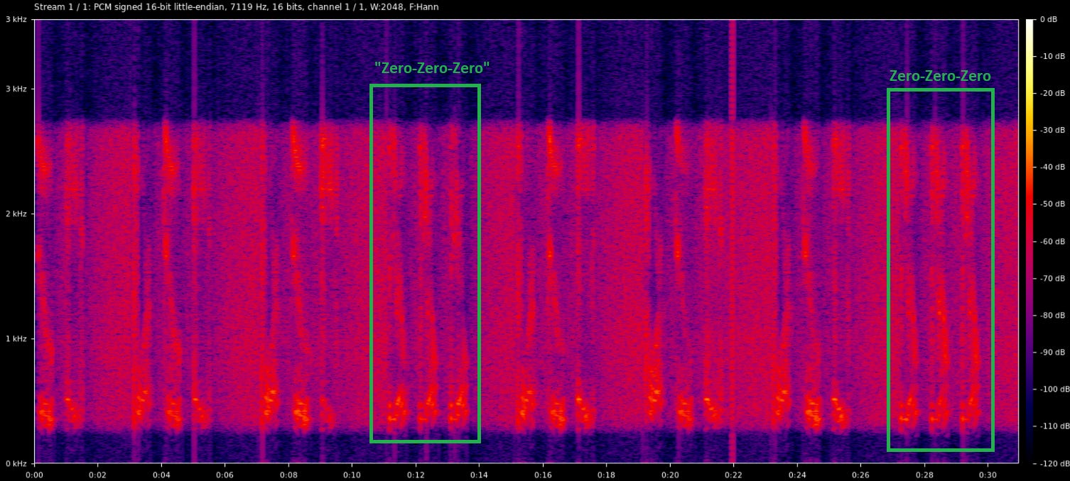 Temporal Behavior: Energy bursts are quasi-periodic, with ~50-100 ms on/off cycles (the vertical “redish” columns at ~0.05 s, 0.12 s, 0.18 s). No continuous broadband noise floor (the level of background noise in a signal or recording system that is present when no useful signal is being recorded) elevation (which would fill the plot in yellow/orange, as in white noise or interference). Instead, we observe discrete “events” which suggest modulated symbols or phonemes. We can go a step further on that, by observing the Vertical Striations and Harmonics but first is worth clarifying what an harmonic is. In short: harmonics are signal components whose frequencies are positive integer multiples of a signal’s fundamental frequency. For example, if a signal’s fundamental frequency is 50 Hz, its second harmonic is at 100 Hz, its third at 150 Hz etc. Back to the analysis, within the red/yellow bursts the faint vertical lines (50-200 Hz spacing) suggest an harmonic structure, with a rapid onset (<10ms) ans a 30-50ms sustained plateau, this is a typical trait of voiced speech, if you like the topic, this happens due to the vocal tract excitation, a nice starting point to go more in depth is: Spectrographic Analysis of Speech, an complete analysis would reveal additional features of the voice (the presence of what is likely the fundamental frequency + low harmonics suggests a male voice). As additional “trivia” from the vertical striations we can clearly spot the NULL (Zero-Zero-Zero) element, below an annotated version (notice how we have two NULL, one at ~0:12 sec, which you can match with the above audio of E07 and one toward the end).