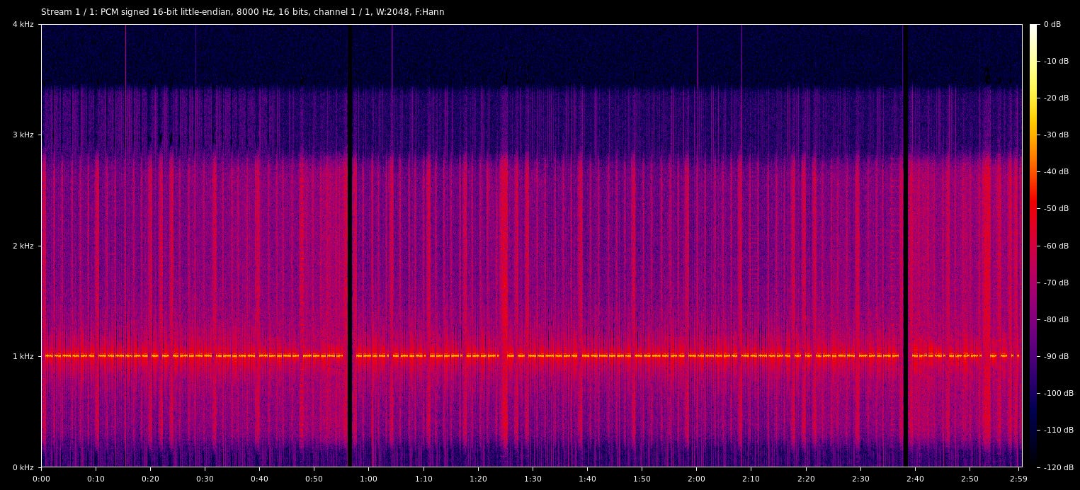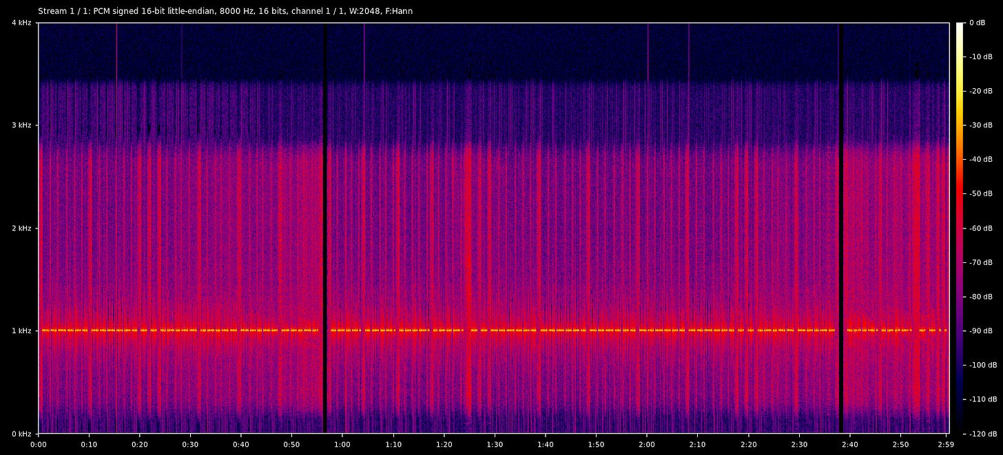 Frequency Axis (y-axis: 0 to 4 kHz): The plot displays a standard 4 kHz baseband audio spectrum, typical of post-demodulation output from an SDR receiver (yep as before we knew and tuned already to the known modulation). Dominant signal energy is confined to a narrow ~80-120 Hz band. Such a narrow, centered concentration suggests a single-tone or low-deviation modulation.